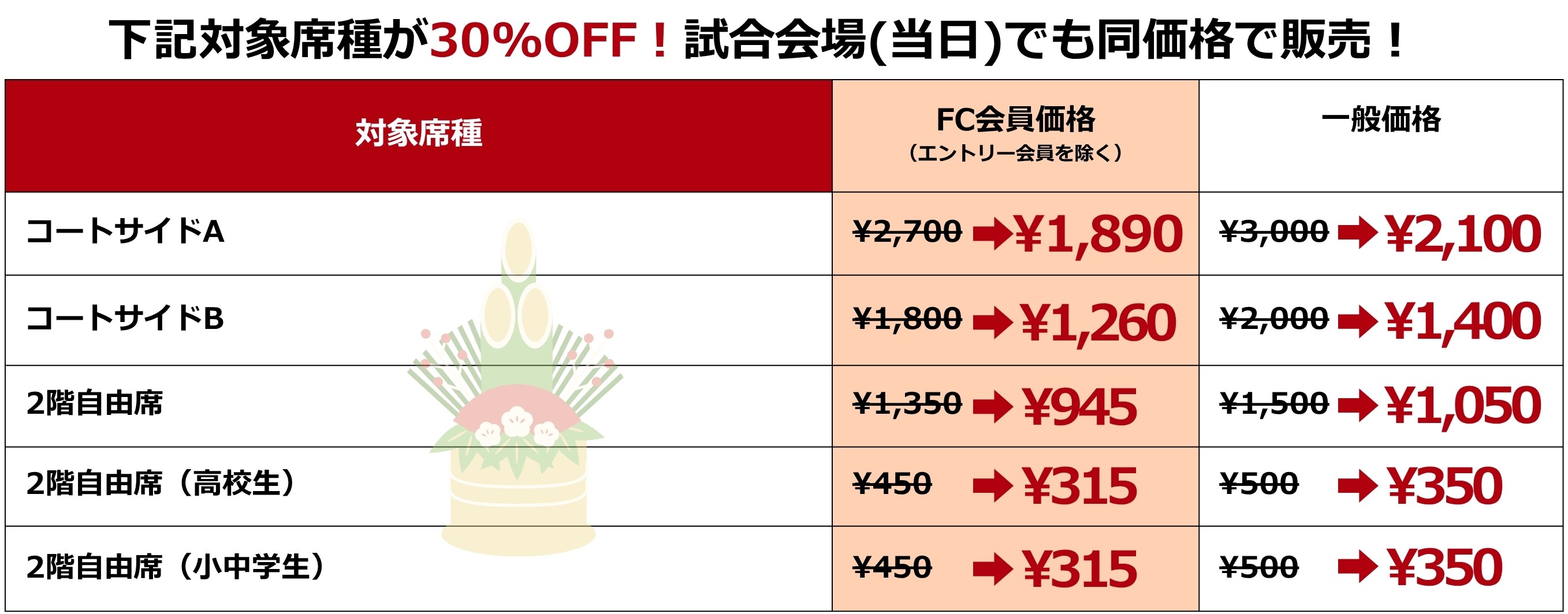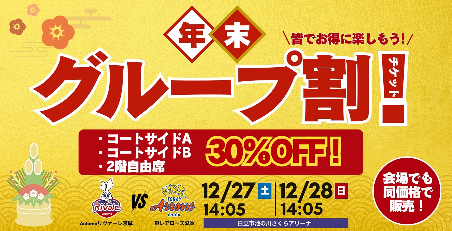 30%offで販売いたします!年末のホームゲーム2連戦は、いつも応援いただいている皆さまと、帰省される皆さまの力を集結させ、リヴァーレの底力を見せつけましょう!