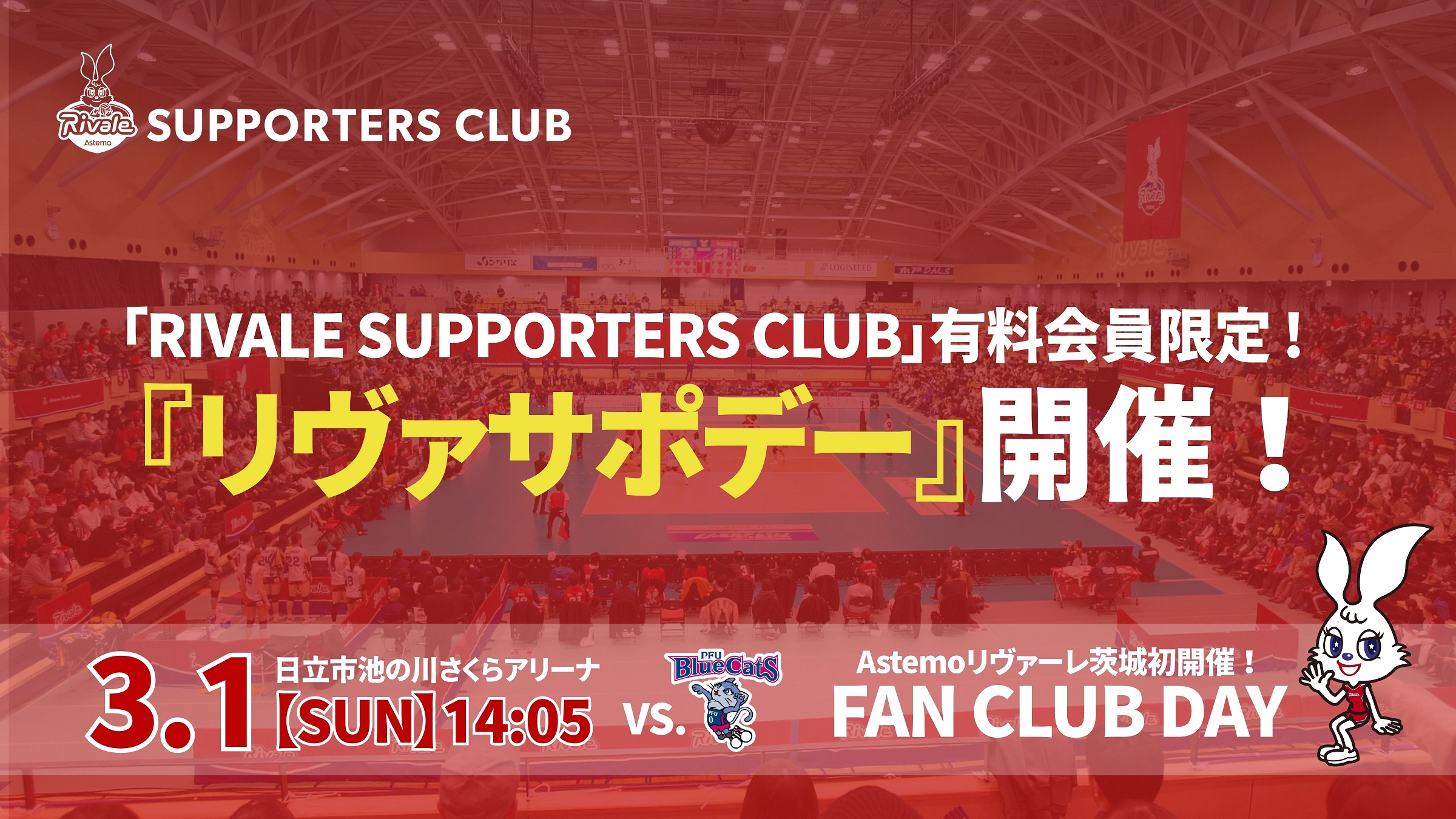 この度、2026年3月1日(日)のホームゲーム(第17節PFUブルーキャッツ石川かほく戦)にて、2025-26シーズン「RIVALE SUPPORTERS CLUB」有料会員さまを対象に、『リヴァサポデー(ファンクラブデー)』を開催することが決定しましたので、お知らせいたします!