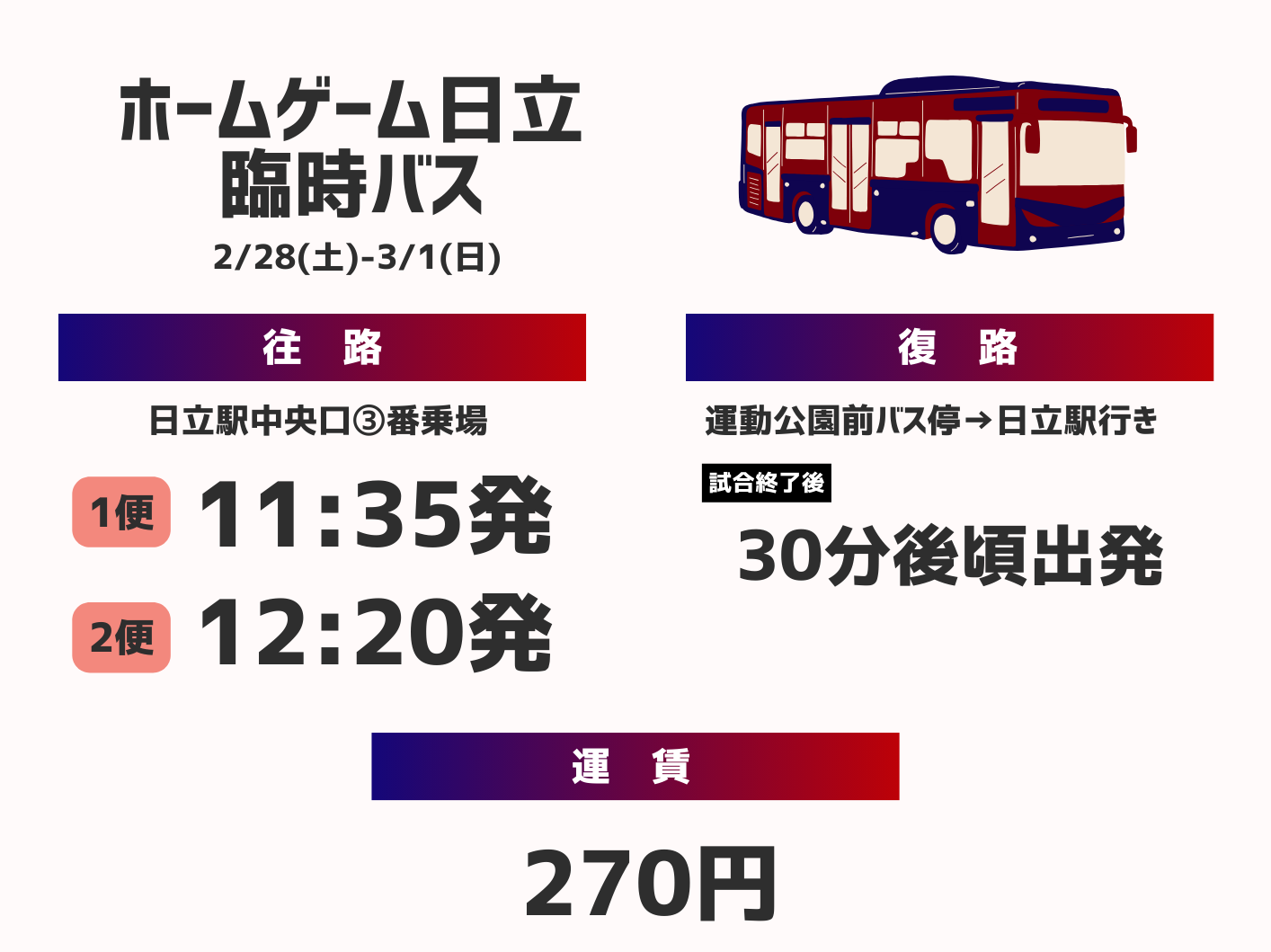 2月28日(土)・3月1日(日)の日立開催ホームゲームを含むホームゲーム全22試合に、