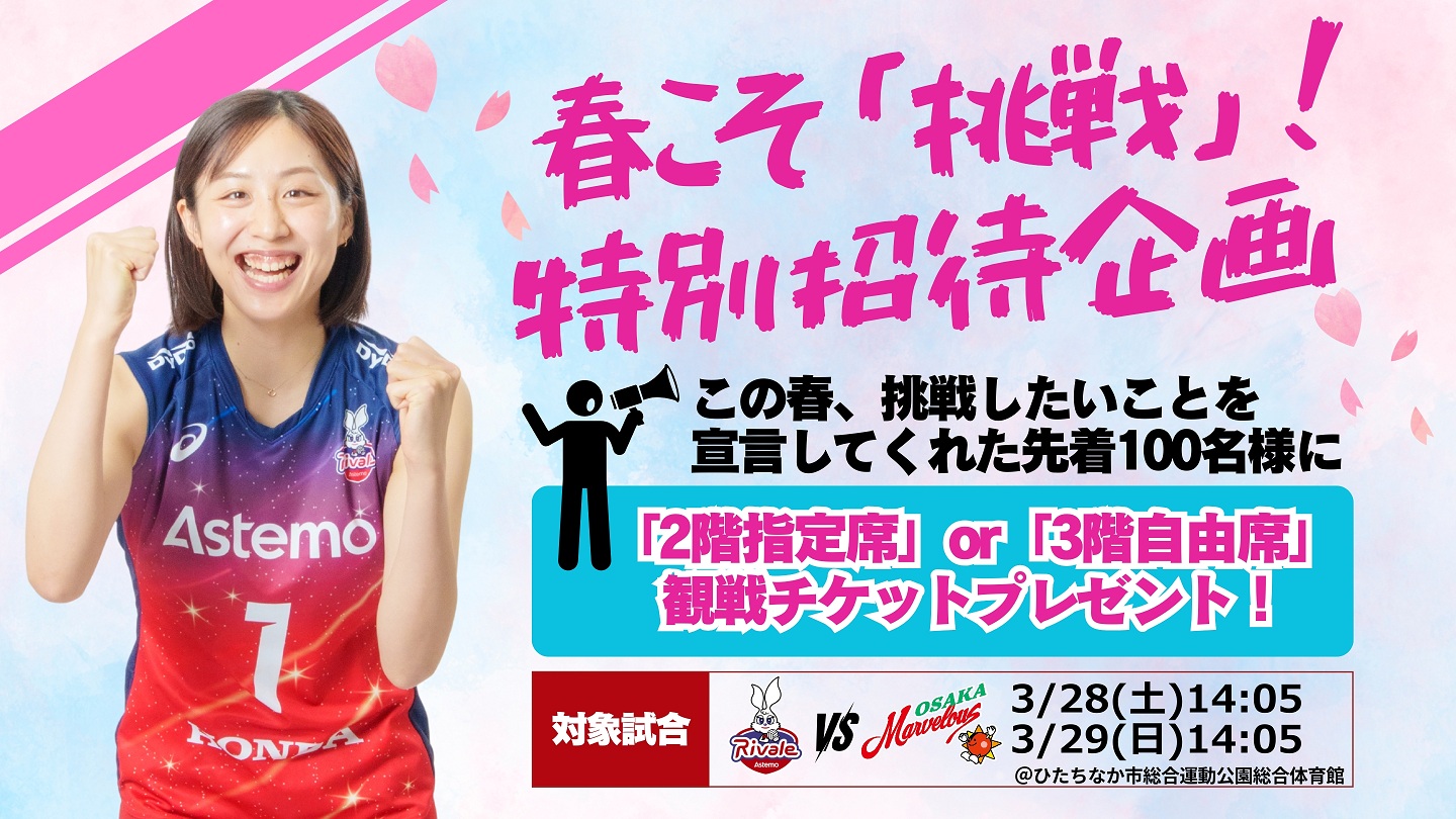 この度、2025-26シーズンのホーム最終節となる「3月28日(土)・29日(日)大阪マーヴェラス戦」を対象に、春こそ「挑戦」!特別招待企画を実施することが決定しましたのでお知らせいたします!