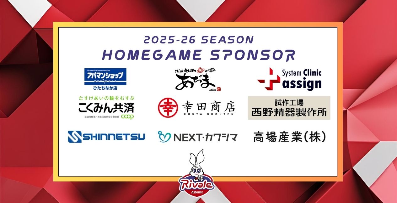 日頃よりAstemoリヴァーレ茨城への温かいご声援をいただき、感謝申し上げます。 Astemoリヴァーレ茨城は後藤商事株式会社 様、株式会社ねぼけ 様、株式会社アサイン 様、全国労働者共済生活協同組合連合会 様、株式会社幸田商店 様、株式会社西野精器製作所 様、新熱工業株式会社 様、株式会社NEXT・カワシマ 様、高場産業株式会社 様と2025-26シーズンも引き続きホームゲームスポンサー契約を締結いたしましたのでお知らせいたします。