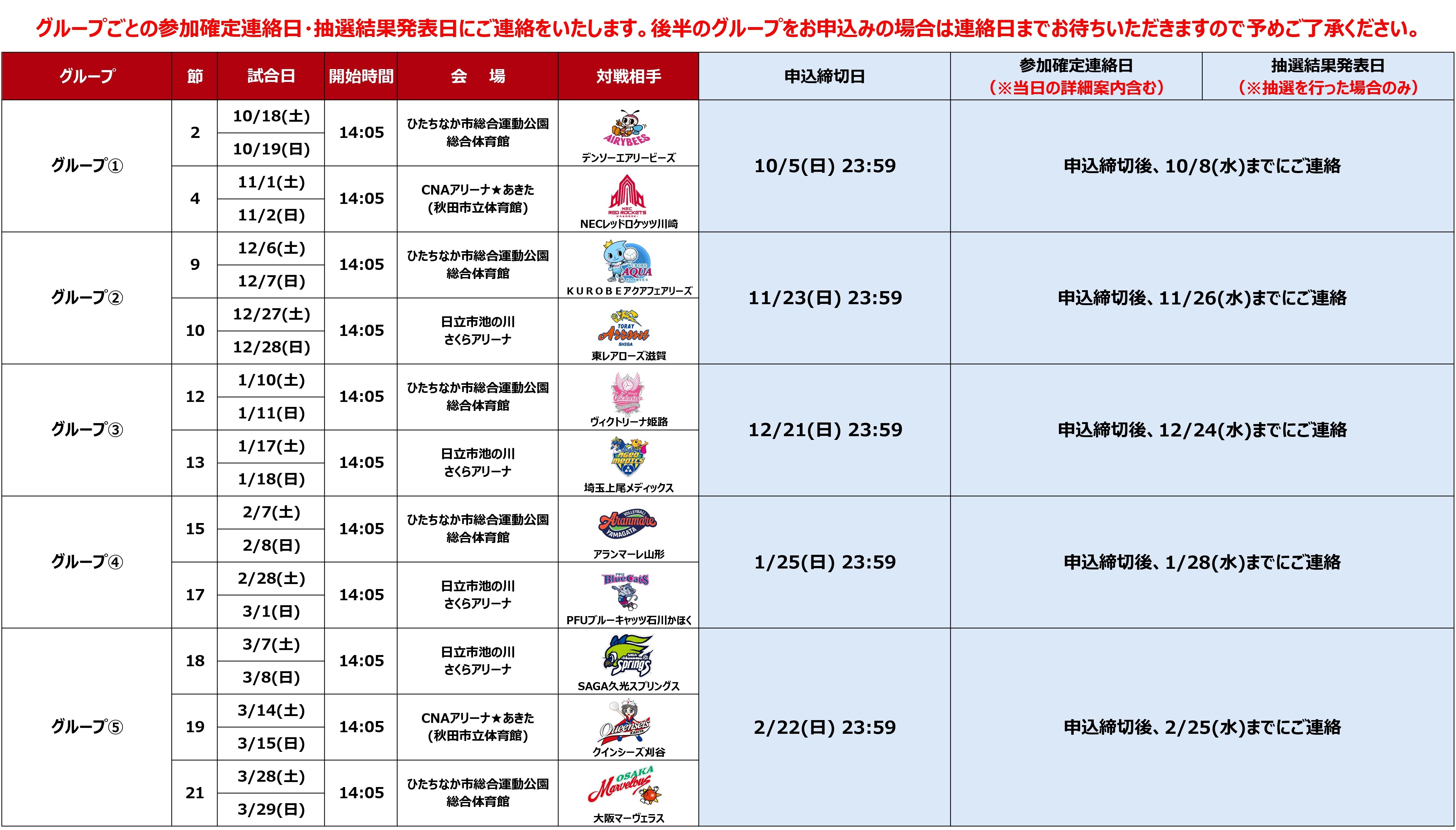 ※参加可否を早めにご連絡できるよう、22試合を5グループに分け、グループごとに申込締切日・参加確定連絡日(当日の詳細案内含む)・抽選結果発表日(抽選を行った場合のみ)を設けさせていただきます。