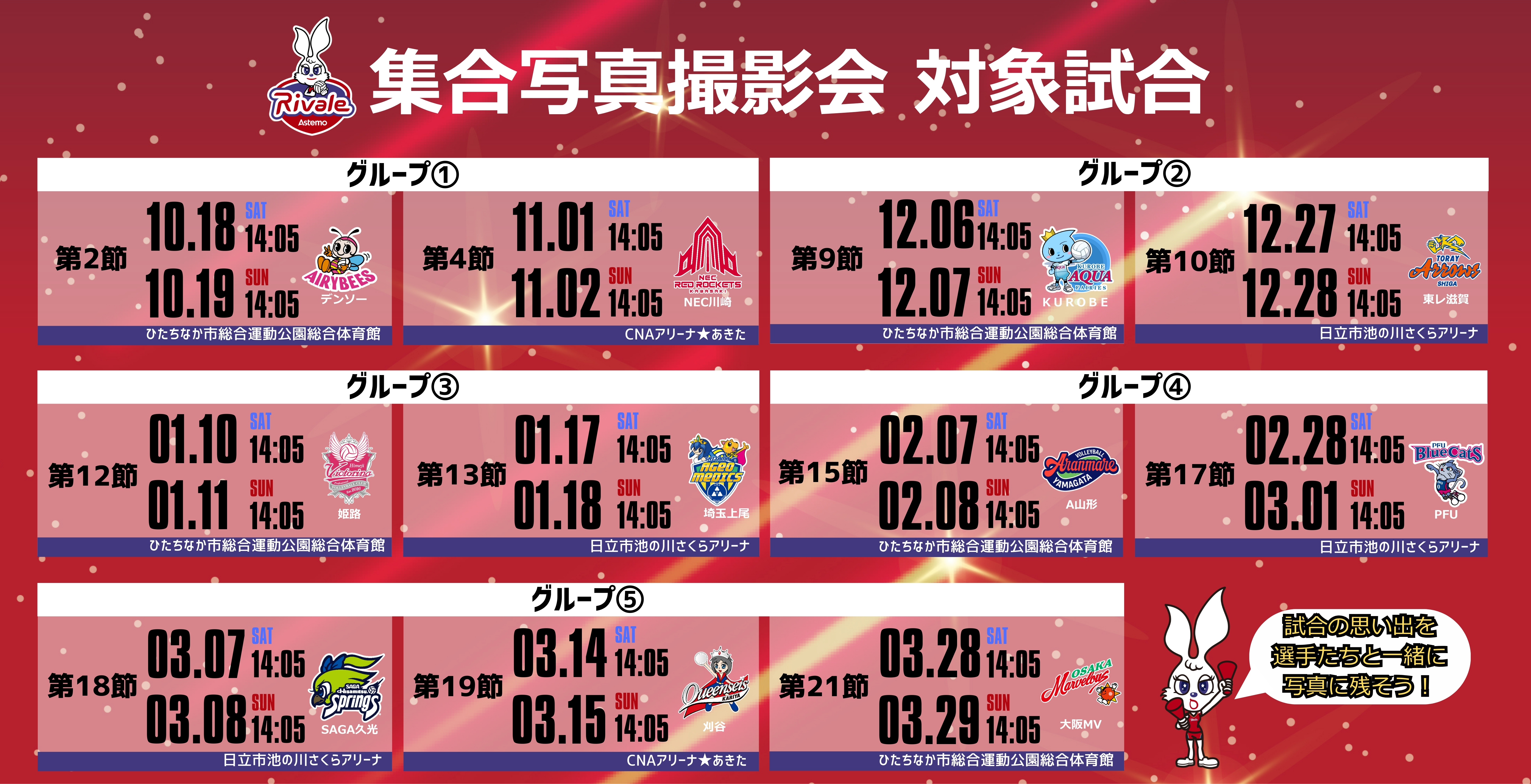 2025-26シーズン「RIVALE SUPPORTERS CLUB」プレミアム会員・ゴールド会員さま限定の『集合写真撮影会』をホームゲーム全22試合で実施いたします!下記概要をご確認のうえ、ぜひお申込みください!