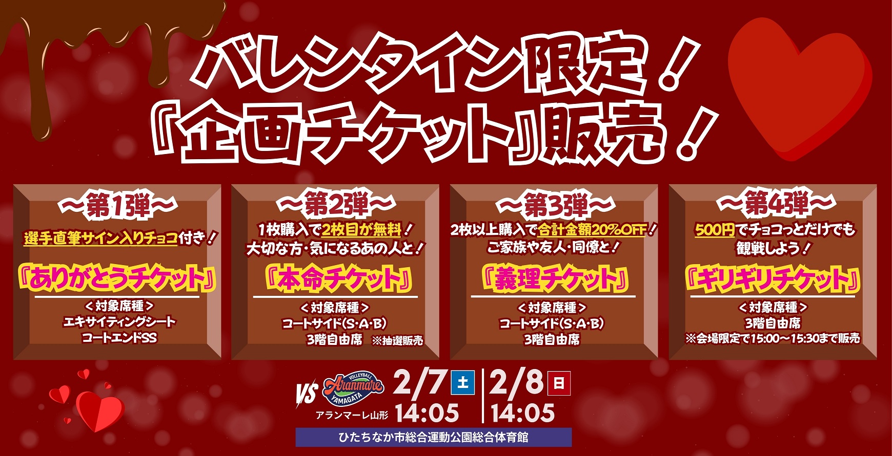 この度、2月14日のバレンタインデーにちなみ、下記2試合を対象に『バレンタイン限定!企画チケット』を販売することが決定しましたのでお知らせいたします!